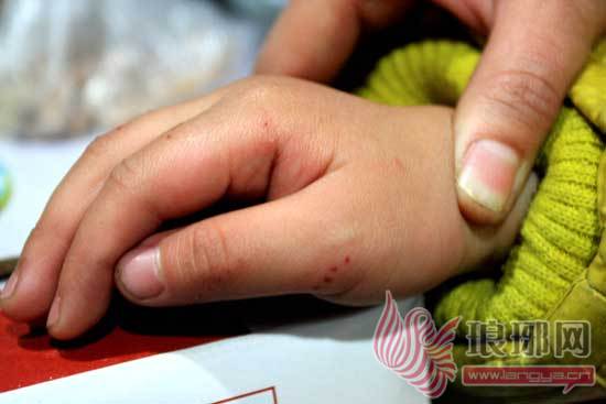 孩子母亲蒋女士介绍说,28日下午,圆圆回到家后,一直在屋里玩,她也就没在意,但准备给圆圆换衣服时,圆圆说手疼,这才发现圆圆右手上被扎了好多小洞,手背上和拇指内侧都有。“我一问才知道原来是在幼儿园里没读出字卡上的字,被老师用梳子的齿尖给打的。”蒋女士说。
