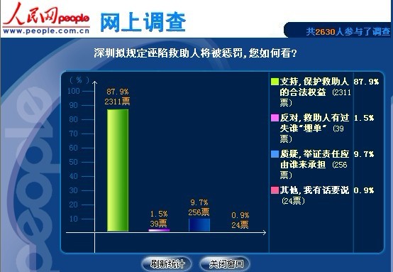 87.9%的网友对深圳拟规定诬陷救助人将被惩罚八成网友表示支持,认为要保护救助人的合法权益 。