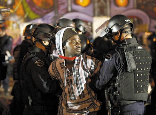 美国洛杉矶市警方30日凌晨出动警力,驱散在市政厅外安营扎寨的“占领洛杉矶”活动示威者,大约200人被捕。