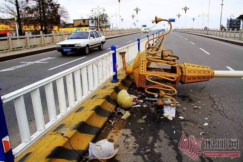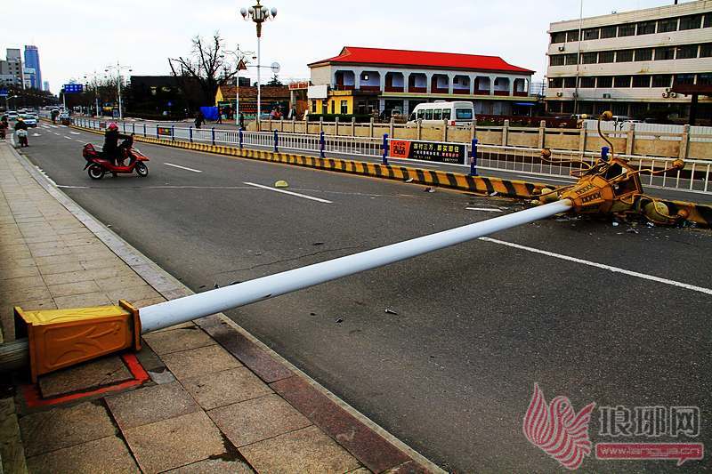 解放路沂河大桥一路灯轰然倒地 堵住来往车辆