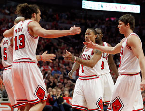 公牛首发阵容:德里克-罗斯、基斯-博甘斯、乔金-诺阿、洛尔-邓和卡洛斯-布泽尔。