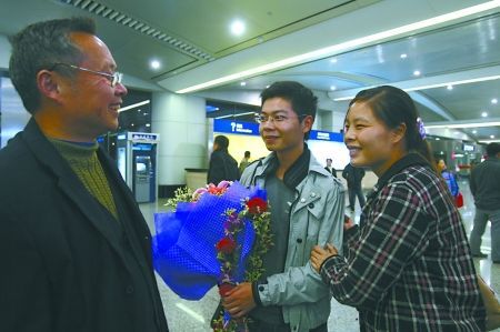12月1日晚,江北机场,梅欢(中)与父亲、姐姐团聚。记者刘嵩摄