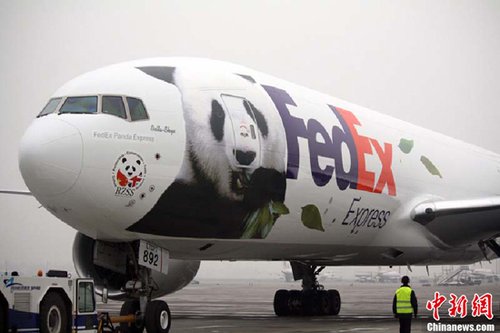 12月4日,两只中国大熊猫“甜甜”与“阳光”搭乘“联邦熊猫快递号”飞机前往英国。搭乘本次“联邦熊猫快递号”的“甜甜”和“阳光”被舒适地安置在两个特制大型集装箱内,确保它们能够自由活动,并透过透明的树脂玻璃观察周围的情况。来自爱丁堡动物园与碧峰峡熊猫基地的一名兽医与两位动物保护专家随行,全程照顾两只大熊猫并密切监测它们的情况。汤彦俊 摄