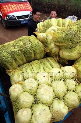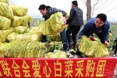 12月4日,在山东省临沂市郯城县马头镇大白菜种植基地,“爱心白菜采购团”成员把购买的滞销大白菜装车。