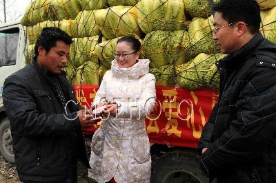 12月4日,在山东省临沂市郯城县马头镇大白菜种植基地,“爱心白菜采购团”成员郑虹(中)把白菜款递给大白菜种植户吴文清。