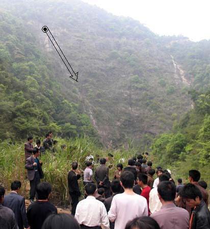 图中黑圈处为跳崖地点,箭头处为发现少女尸体处