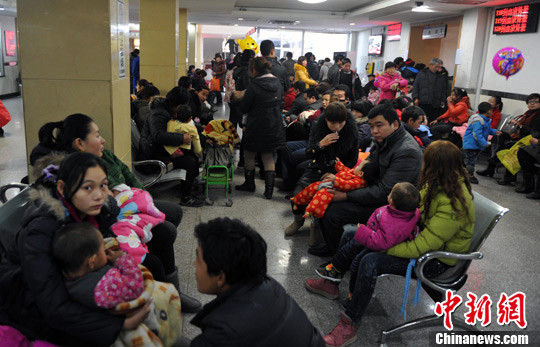 12月5日,在河北省儿童医院呼吸科大厅内,坐满了抱着孩童前来看病的父母