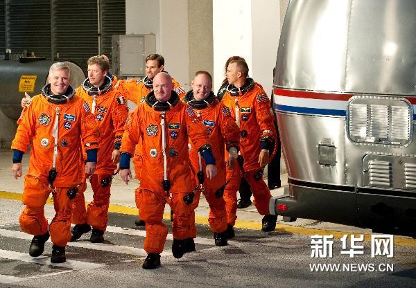 5月16日,“奋进”号航天飞机宇航员前往位于美国佛罗里达州卡纳维拉尔角肯尼迪航天中心的发射塔。经过两个多星期的维修,“奋进”号航天飞机15日晚再次加注燃料,等候16日早晨开启“绝唱之旅”。 “奋进”号原定4月29日执行第25次也是最后一次飞行任务,为国际空间站送去用于寻找暗物质的阿尔法磁谱仪,因一个控制电力供应的开关盒故障而数度推迟发射。新华社/法新