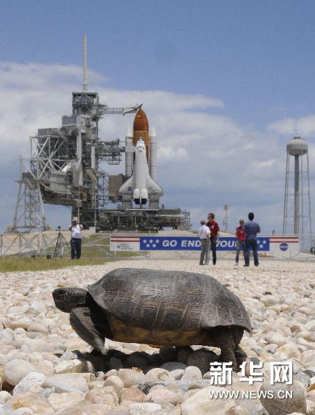 5月15日,在美国佛罗里达州肯尼迪航天中心,一只乌龟从镜头前爬过,远处“奋进”号航天飞机已准备就绪,预计将于当地时间16日早发射。 “奋进”号原定4月29日执行第25次也是最后一次飞行任务,为国际空间站送去用于寻找暗物质的阿尔法磁谱仪,因一个控制电力供应的开关盒故障而数度推迟发射。新华社/法新