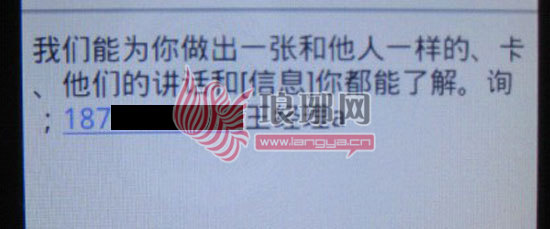 3日上午,家住兰山区的王先生收到一条短信,称只要提供他人的手机号码,对方就可帮办一张相同的手机卡,从而窃听其与任何人的电话和短信,从而刺探他人隐私。“这是真的假的啊?如果真能这样,不就违法了么?”为一试真伪,王先生拨通了短信上的电话。