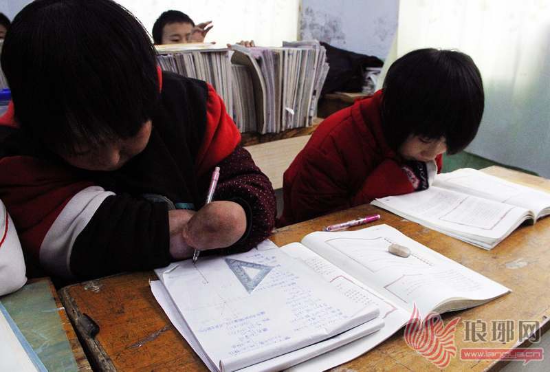 “听说你写字又快又好看,能不能写给我们看看。”听到记者的话,刘洁从桌洞里拿出笔,两个残缺的胳膊抱着笔,在作业本上认真地写起来,而写字的速度丝毫不逊于其他同学。更让人意外的是,她竟然利用没有双手的胳膊作几何图形,拿三角尺、铅笔,标刻度,这些动作都一气呵成。