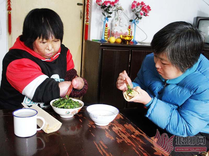一碗青菜和咸菜便是刘洁和妈妈的午餐。记者 展萍 摄