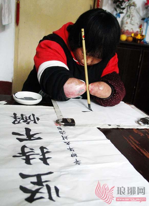 今年10月,沂南县在全县中小学组织了一次书画大赛,在初步确定为一等奖的学生作品中,一幅书法作品让不少评委眼前一亮。评委指着作品问作者是谁。这时有人说,写这幅作品的学生是个年仅15岁的残疾孩子,但她没有双手。
