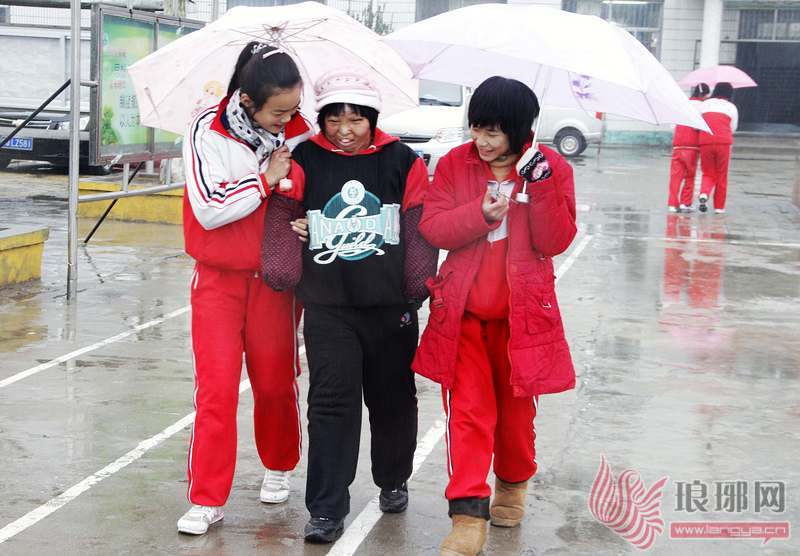 由于天气不好,放学后同学们送刘洁回家。记者 展萍 摄
