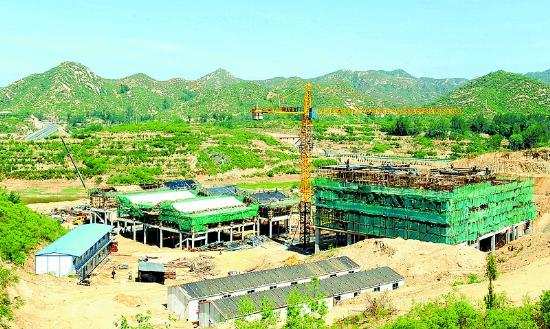 5月16日,正在施工中的西柏坡红色胜典主题公园建设现场。作为省重点工程,西柏坡红色胜典主题公园景区位于岗南水库的北岸,与西柏坡纪念馆隔水相望。项目一期规划占地1200亩,投资约6亿元,总建筑面积2.8万平方米。该工程将于今年7月1日完工。 本报记者 周晓喻摄