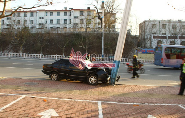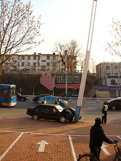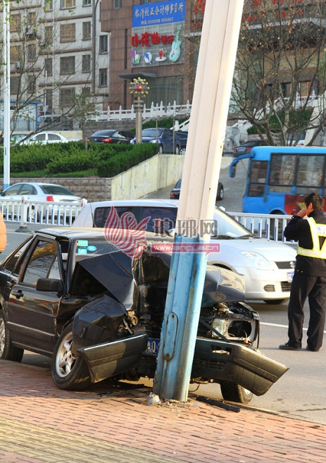 9日下午3时许,在金雀山路气象大厦段路北,发生一场车祸悲剧。一辆疾驰的黑色普桑径直撞向路灯杆,男性司机当场死亡,事故原因不详。