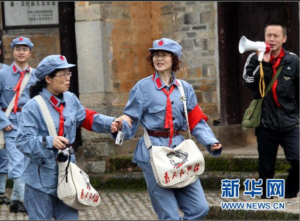 4月17日,身穿红军服装的革命传统教育学员们在参观革命遗址。近年来,江西井冈山在积极发展红色旅游经济同时充分发掘修复革命遗址,整理研究红色资源,注重宣传革命根据地红军精神,始终把革命传统教育放在第一位,取得良好的社会和经济效益。新华社记者汪永基摄