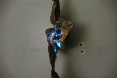 昨日,记者将李先生买到的这块猪肉放到无光环境下,果然可见一片幽蓝色的光从部分猪肉中透射出来。