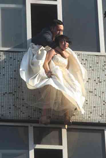 16时21分28秒,“跳了”,随着一声惊呼,李某一用力从窗口跳了下去。就在人们为李某的安危担心时,从七楼的窗户里一只右臂突然伸出,一把搂住了李某的脖子,左手则伸出来拽住了婚纱。原来,郭中凡看准情形,一个箭步跨了上去,在李某的身体没下落之前拽住了她。由于用力过猛,郭中凡的上半身磕在了窗户上,发出了“哐”的响声,之后也探出了窗口。