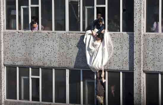 营救人员从楼下托住她