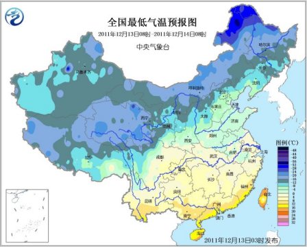全国最低气温预报图。图据中央气象台网站