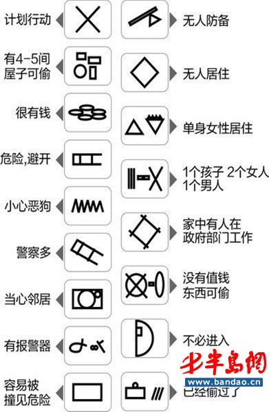 ×代表“计划行动”,◇代表‘无人居住’,正三角和倒三角组合代表“单身女性居住”,长方形加斜杠线代表“已经偷过了”,两个长方形罗列则代表“容易被撞见,危险”……在一张A4大小的白纸上,17种“秘密符号”罗列其中,还有些更加复杂的符号,各自有着神秘的意义,比如警察多,当心邻居,等等,这就是成都警方公布的盗贼17种“秘密符号”。