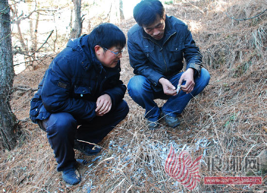 当日10时许,会员们沿北麓登崮,当行至崮坡马尾松林深处时,铺满松针和落叶的地面上,一堆鲜亮的鸟羽引起了大家的注意。按惯常的思维,冬季这种深山老林里出现鸟类的羽毛或残骸,应该是猛禽和兽类吞噬猎物后的遗留物,是常见现象,并不会引起特别的注意。但负有考察任务的会员们心细如丝,对与岱崮地貌生态环境相关的自然现象格外关注。他们不由上前仔细观察,在这堆凌乱的羽毛里面,竟然发现一枚大羽片上隐约可见带有文字的朱红印迹。取出近观,羽片上“喜出望外”的字样清晰可见,令人十分惊奇。继而,他们小心翼翼地把这堆羽毛重新翻了一遍,又从中发现了多枚分别印有“市级锦标、鸿运当头、先锋开拓、天罡前奏”的完整羽片。根据这些羽毛特征和文字含义透露出的信息,大家推断这些羽毛应是一羽信鸽所留。