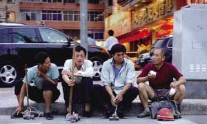 韩培印(右一)和工友们在路边等活
