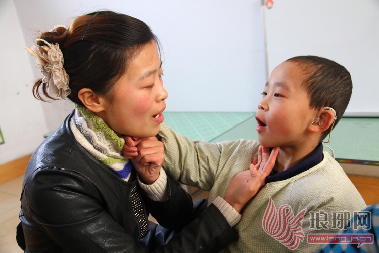 这时,在小院的二楼教室里传出孩子们诵读的声音。“萝卜……”一位老师正在嘴对嘴地教孩子们发音,她一只手放在孩子的颔下,另一只手拿着孩子的手放在自己的颔下,张大口型重复着单词,一遍一遍地重复着。其他的孩子们都背着小手,挺直着腰板团坐在老师周围,眼睛专注地盯着老师夸张的口型,鼓起小嘴,大声卖力地重复着。这就是那位特殊的老师刘宗艳和她特殊的学生们。