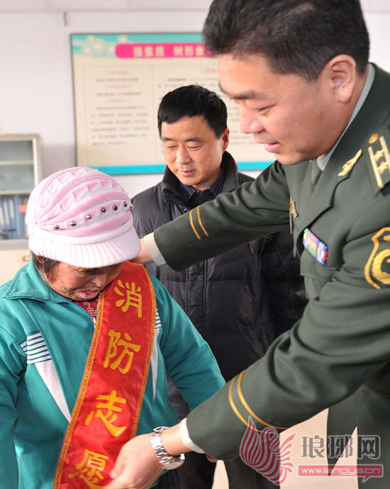 临沂消防支队副支队长刘鸣将“消防志愿者”的大红绶戴在刘洁的身上。