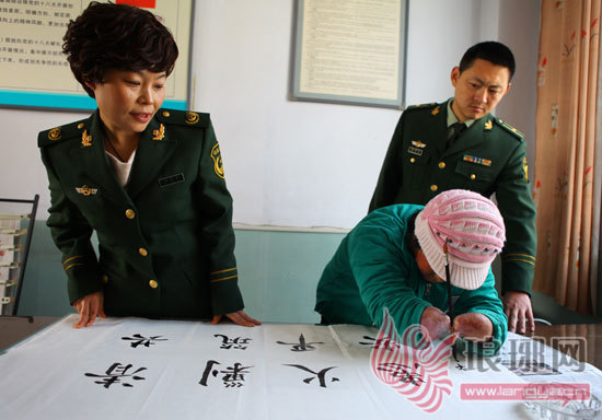 刘洁用残缺的手臂夹着毛笔,写下了“清剿火患共筑平安”八个字。