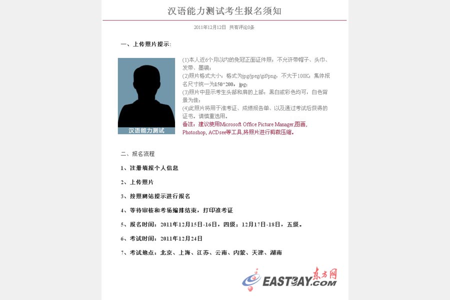 还记得网上疯传的“让老外也考汉语四六级”吧?现在,我国首个“汉语能力测试”开始接受报名(http://www.hnc.org.cn/),全国共在上海、江苏、云南、内蒙古等7地试点考试。报考对象无论职业、年龄、学历、在职与否,均可以根据自身情况报名参加测试。不只针对老外,所有使用汉语的人都可以报名参加。据悉,汉语能力测试共分为六个等级,其中一级可到超市买东西,四级相当于具有高中毕业的汉语水平,六级相当于具有本科及以上的汉语水平。