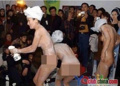 从照片中来看,三名女子仅头上包裹著浴巾,身上不但一丝不挂,甚至疑似三点全露,而「洗澡」的场地虽然在室内,但也没有任何遮蔽,就仅是在地上铺著大块的白色防水布而已。另外,她们还大方请观众来「帮忙洗」,让现场围观民众拿著有装沐浴乳的喷枪往她们身上喷,说是「体验」沐浴乳。