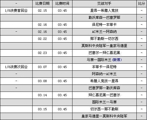 下面是欧冠1/8淘汰赛的具体赛程(均为北京时间):