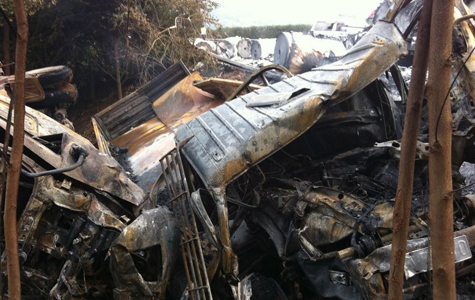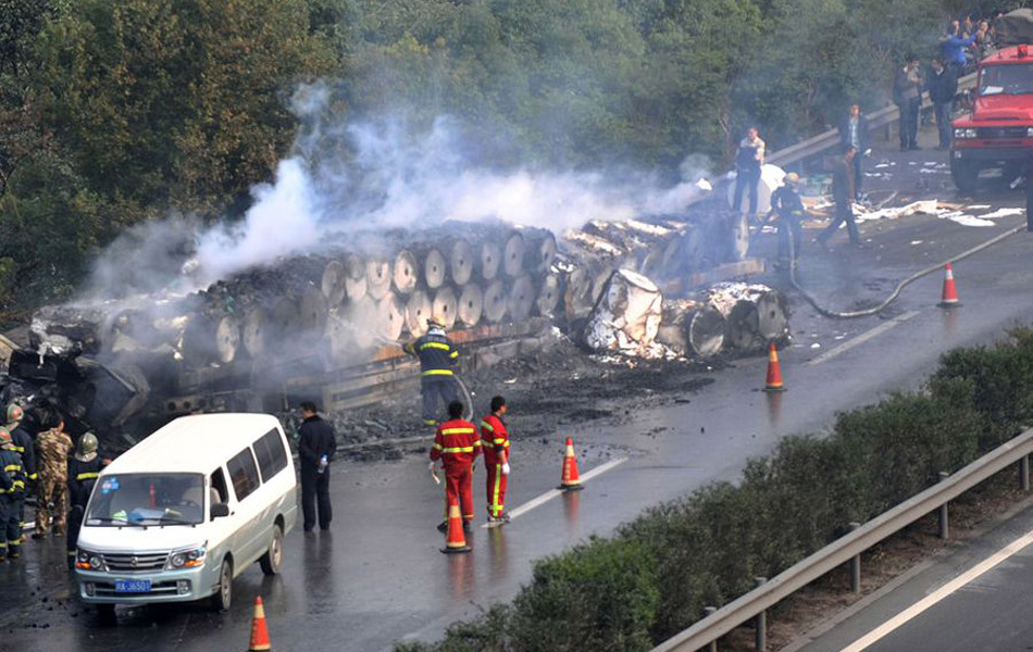 12月15日,四川省成都市,在成南高速回成都方向离成都出口收费站27公里处发生一起严重车祸,四辆货车相撞在一起并发生燃烧,导致3人死亡。图为消防人员正扑灭一运纸车上的余火。