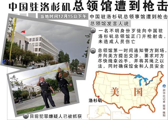 中国驻洛杉矶总领馆当地时间15日下午遭到枪击,未造成人员伤亡。事发后,总领馆第一时间通知警方到场,并向美方提出交涉,要求对方尽快缉拿凶手,并将其绳之以法,同时确保馆舍和人员安全。