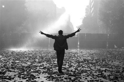 12月17日,在埃及首都开罗,一名示威者站在满地碎石的街道上。新华社发