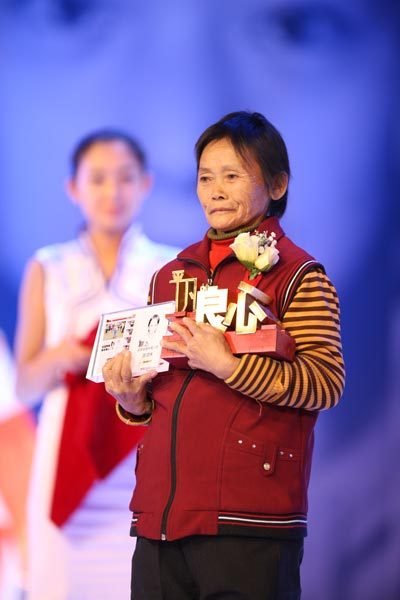 12月17日晚,“2011平凡的良心”颁奖盛典在北大百周年纪念讲堂举行,当救助小悦悦的拾荒阿姨陈贤妹出现在领奖台时,全场观众自发起立,送上了最热烈的掌声。陈贤妹的普通话讲得不好,但是大家都听懂了她的话——“多谢大家。我只做了自己应该做的事”。图为陈贤妹领“良心人物”奖。
