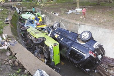 18日,菲律宾南部,汽车被洪水冲进沟里。热带风暴已导致菲律宾652人死亡。
