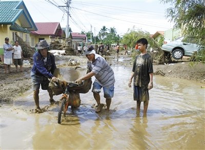 热带风暴“天鹰”16日晚在菲律宾南部棉兰老岛登陆,两个沿海城市——伊利甘市和卡加延德奥罗市部分村镇受灾最重。很多村庄被突如其来的洪水冲走,附近的山体也被暴雨冲垮。由于之前没有预料到风暴如此猛烈,很多人在睡梦中就被洪水夺去了生命。