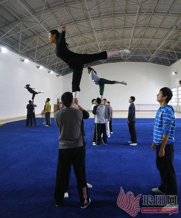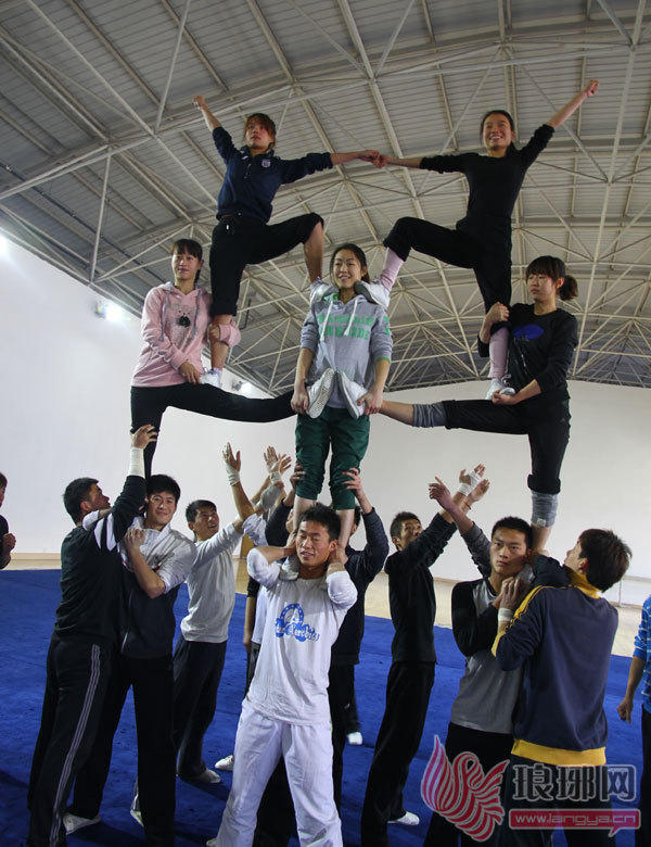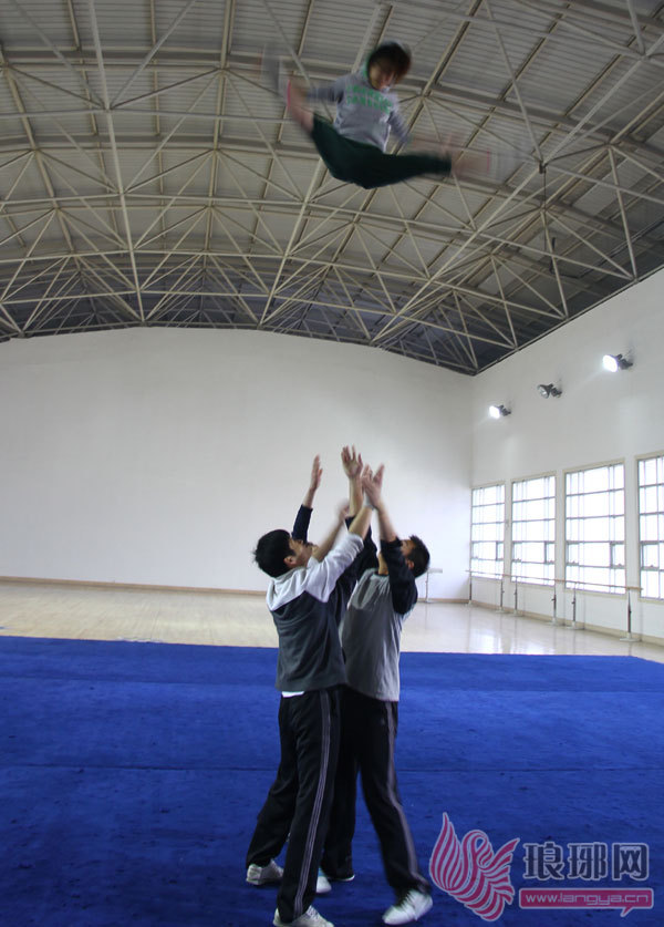 一个身材玲珑、着运动装的女孩被三个男孩抛向三四米高的空中,如抛物线般,女孩在最高点做出一个漂亮的转体空翻后,又轻盈的落回同伴们的手中。眼前即是临沂大学技巧啦啦队队员们刻苦训练的一幕。
