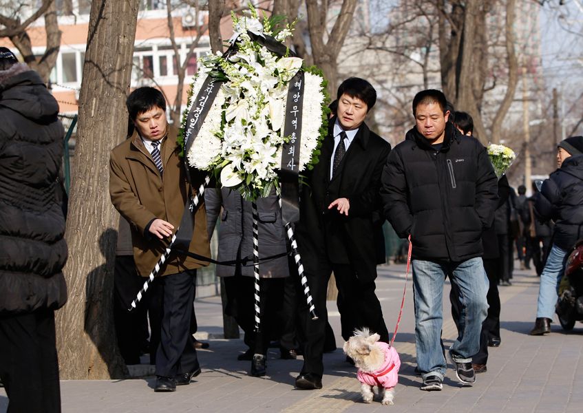 12月20日,在京朝鲜人抬着花圈前往朝鲜驻华大使馆。