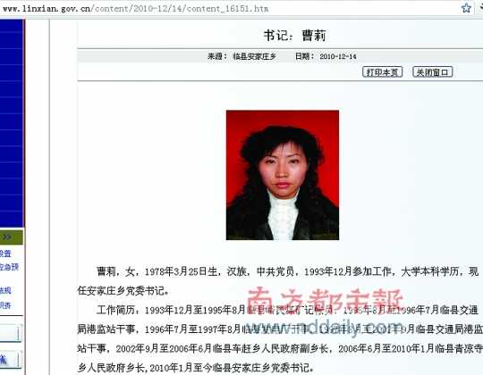 临县政府网站的组织机构栏目,有一段去年12月14日发布的曹莉简历,内容显示她确实生于1978年,但参加工作的时间是1993年12月,任职当地一家煤矿的“记账员”;1995年8月调至该县交通局港监站任“干事”;1996年7月任临县发电厂干事;1997年8月,又调回交通局港监站,还是任“干事”,5年后进入乡政府系统,去年1月任安家庄乡党委书记。