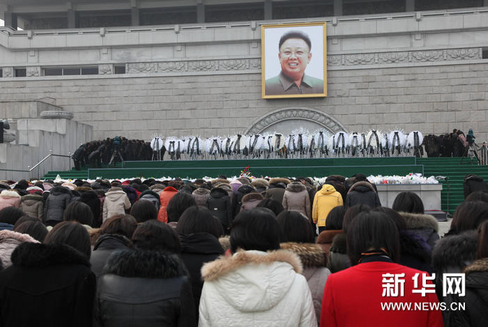 12月21日平壤市民继续到设在首都各处的吊唁点进行吊唁。从19日中午12时到20日中午12时,前往各处吊唁场所哀悼金正日逝世的平壤市民已超过500万人次。平壤市民在金日成广场向金正日巨幅画像默哀。新华网记者 张利 摄