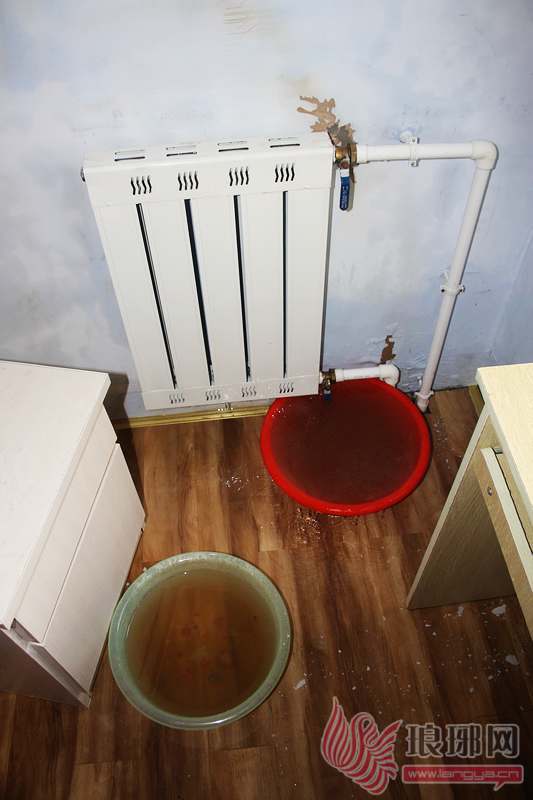 22日下午3时,记者来到兰山区泰和花园S2栋楼14楼中户赵先生的家。记者看到赵先生家木地板上全是水,最深处近10厘米。赵先生一家正用扫帚等工具向外扫水。在他家小卧室里,记者看到暖气片与手动阀门的接口处仍向下滴水,暖气片下的两个盆已经接满了水。末梢附近的墙皮已经脱落,而卧室的墙壁几乎全湿了。