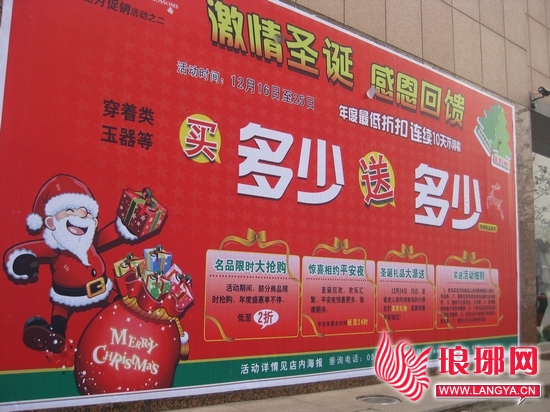 在临沂市桃源大世界,记者看到,该商场在活动宣传海报上打出了“年度最低”的促销标语。“圣诞节可以说是商场年终最大力度的促销,”临沂市桃源大世界策划部赵经理告诉记者,自2003年,该商场就把圣诞作为整年中促销计划的重头,而这一促销重点的形成主要是为了迎合消费者的需求。