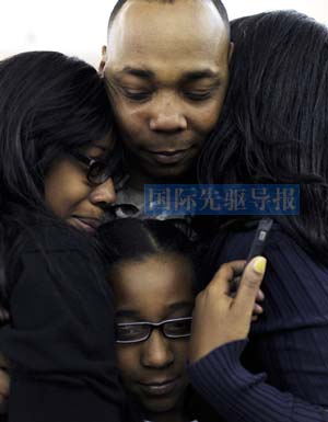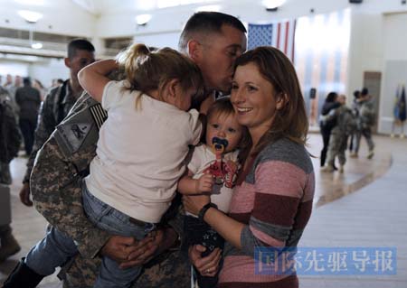 12月13日,一批从伊拉克撤离的美军士兵抵达美国布利斯堡基地。图为33岁的上士瑞恩·贝尔维在欢迎仪式上拥抱妻女。记者 张军/摄