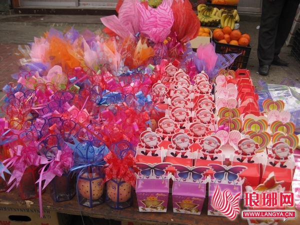 在临沂三小附近,记者看到经过包装后的“平安果”被摆在了各小商铺的显眼位置,五彩斑斓的漂亮包装吸引了不少学生驻足。这些“平安果”的包装各有不同,有的用几张彩纸包裹,有的被装在印有圣诞老人的小包装盒里,每个小盒只有一个水果,非常精美。