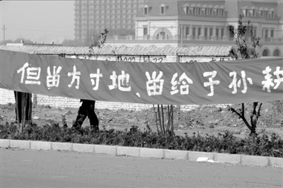 17日,香河县安平镇谢屯村农民打出横幅,要求还农民土地。
