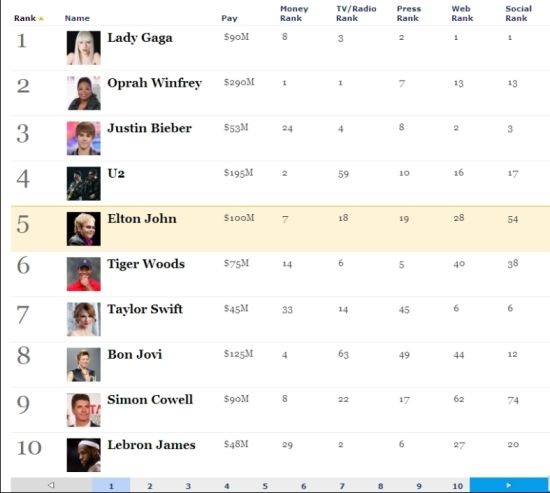《福布斯》每年都会根据名人的收入、媒体曝光量、社会影响力等综合参数来确定排名,从而推出“100名人榜”。在今年榜单的前十位中,体育界只有高尔夫的泰格-伍兹和篮球的詹姆斯入围,其他八人均为娱乐明星。